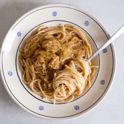 Cook the pasta 1 minute less than instructed. Set the remaining onions aside before adding the sauce back to the casserole and heating it up gently. Using tongs, transfer the spaghetti into the casserole. You can also drain the pasta, but make sure to keep some of the water. Add a generous spoon of the pasta water and finish cooking the spaghetti in the casserole until perfectly al dente. Serve topped with the remaining onions.
