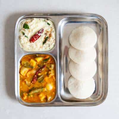 Idli are steamed fluffy rice cakes that are made from a fermented rice and lentil batter. A South Indian specialty, they are traditionally eaten for breakfast, but make a fantastic lunch or dinner that just happens to be vegan, especially when paired with sambar & a coconut chutney. Making idli, sambar and coconut chutney from scratch can take a bit of time, so if you just want to give the idli a go, they work great with any Indian dishes that you’d usually eat with rice.
