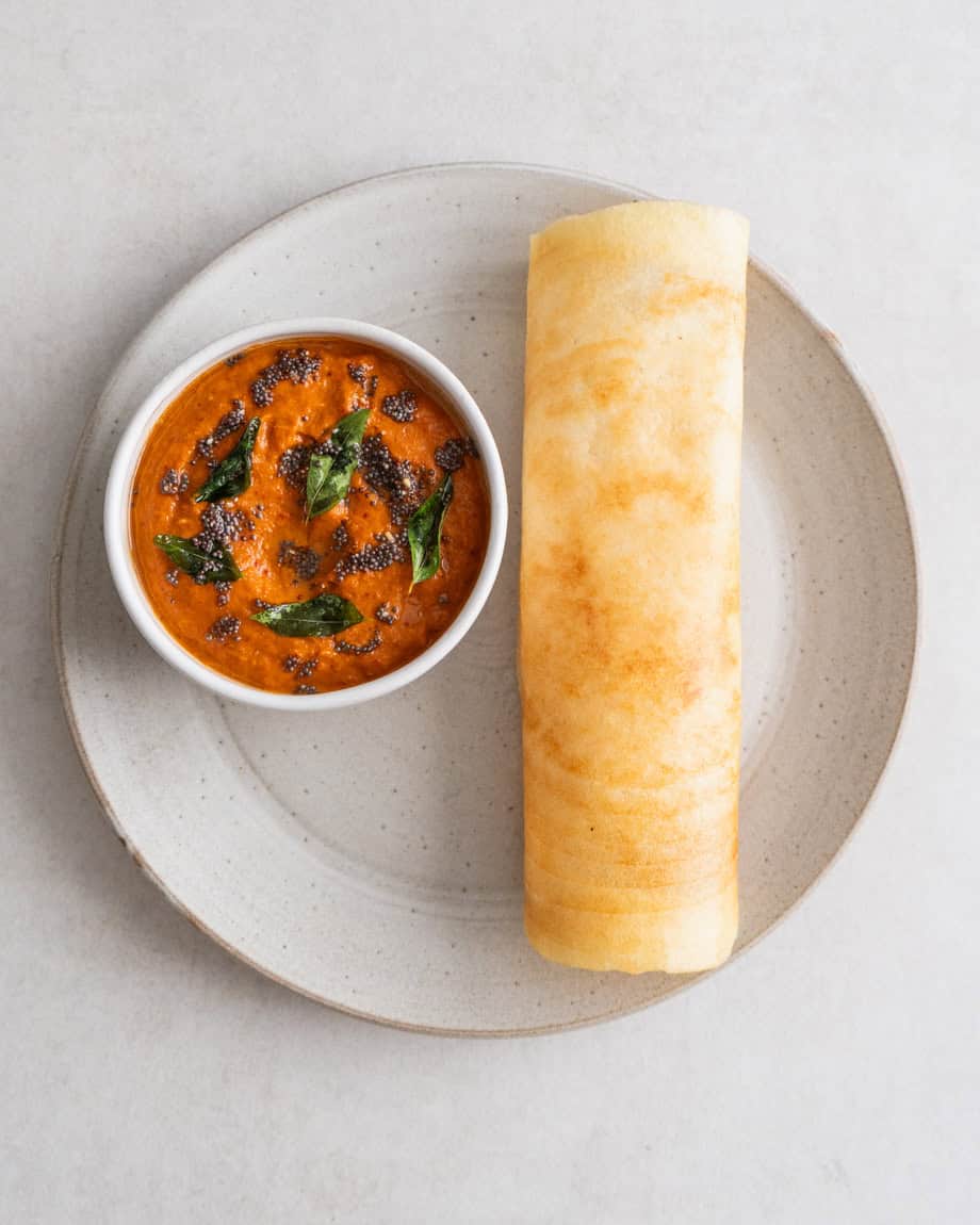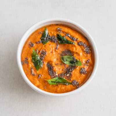 Kara Chutney is a popular South Indian condiment characterized by its vibrant red color and tantalizing blend of aromatics and is often served alongside Dosa or Idli. The word “kara” in Tamil means “spicy,” which perfectly describes the chutney’s bold and fiery taste.