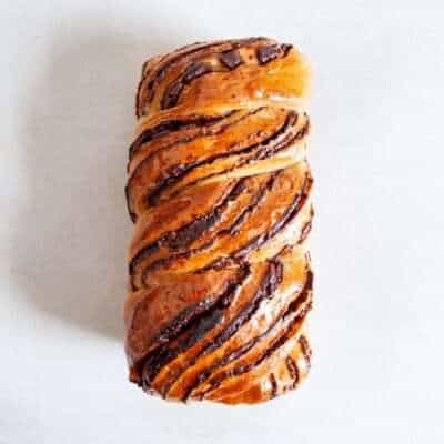 - Pre-heat the oven to 180°C. Mix together the maple syrup & hazelnut milk and brush it over the dough. Then bake the babka for 40 minutes or until golden.