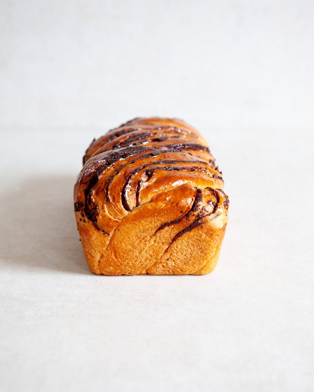 When the babka is ready, remove it from the oven and brush it with all of the syrup. Once it’s cold enough to handle, tip it out of the loaf tin and leave it to cool entirely on a cooling rack.