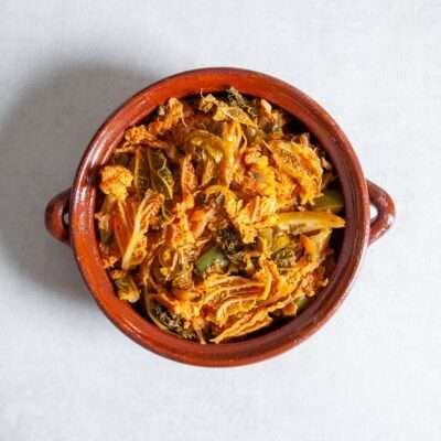 In the spirit of making use of what’s available, I’ve taken the freedom to make a few small changes to adjust it to what I could buy locally. I used savoy cabbage instead of the Mallorcan white cabbage, which tends to have much softer leaves than the white cabbages you’d get in the UK. Mallorcans use stale slices of a local brown bread, thinly sliced, but a wholemeal sourdough works well too. And lastly, the island is known for its recent revival of the Tap de Cortí, a type of sweet pepper that is dried and ground into a powder and found in many traditional Mallorcan delicacies. It is difficult to get elsewhere, so opt for a good-quality Spanish sweet paprika instead. Although not traditional, you can add cooked beans like haricot or red kidney for some protein.